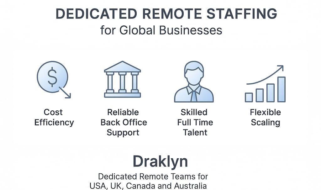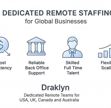 A concise overview of how dedicated remote staff help businesses in the USA, UK, Canada and Australia reduce costs, improve back office efficiency and scale operations with reliable full time support. The post explains key benefits, essential roles and how Draklyn builds high performing remote teams for long term growth.